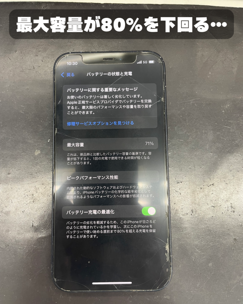 今回は、実際にスマップル静岡店にお持ち込みいただいた「バッテリーが限界を迎えたiPhone」の事例をもとに、交換の目安や当店の修理についてご紹介します。